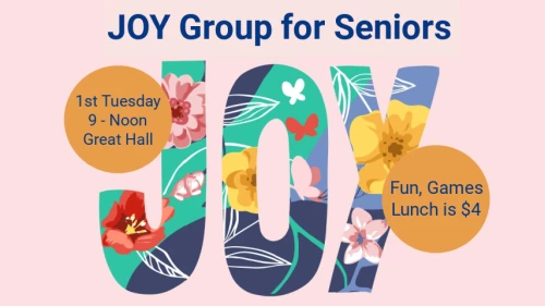 We provide several events for seniors throughout the year. A monthly event is our JOY group that meet on the first Tuesday of every month in the Great Hall for Food, Fun, Fellowship. There is a small fee for lunch.